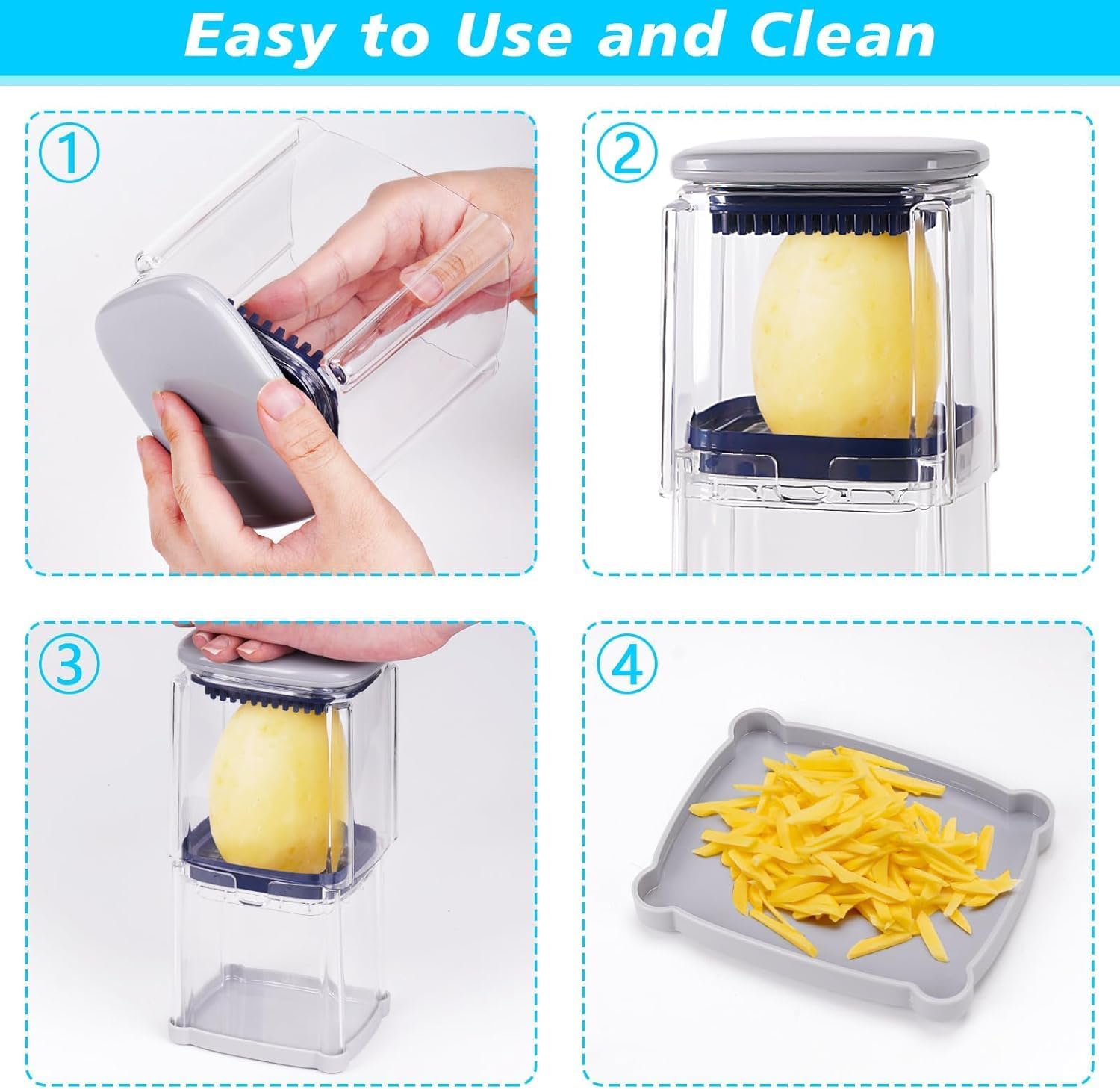 - Easy To Use & Clean - This food chopper is very easy to use.Simply place the vegetables in the food container, cover it, and press the top handle to slice the vegetables. The French fry cutter is also easy to clean, as the disassembled parts are dishwasher-safe, making cleanup a breeze.