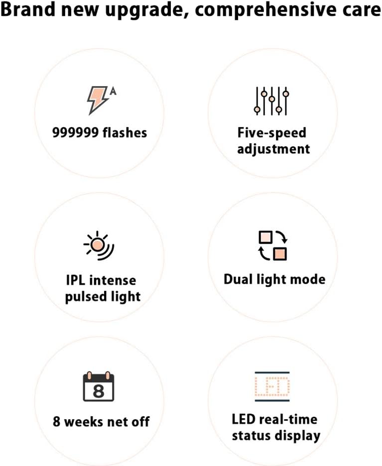 - New IPL Hair Removal: The hair removal device provides a gentle irradiation experience, 8 weeks of net hair removal. It can not only lock the melanin in the hair follicles, and cause the hair roots to fall off, so that the hair in different parts of the human body will not grow, and the light is soft and does not stimulate the skin. Photon hair removal can not only effectively remove facial hair, but also promote cell regeneration, reshape the texture of pores, and restore skin elasticity.