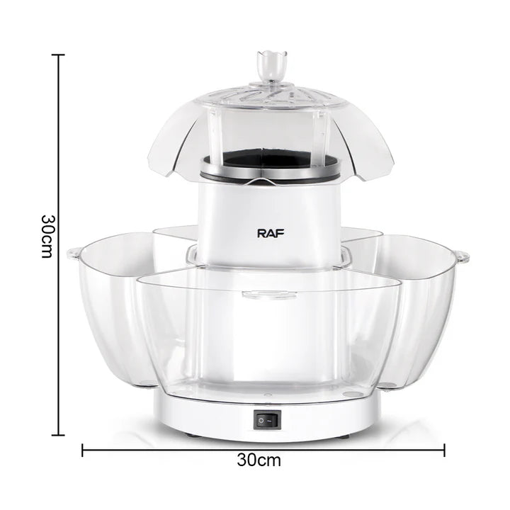 - Enjoy fresh, oil-free popcorn in minutes with the RAF Electric Popcorn Maker (Model R.9004). With just one button, it uses hot air circulation technology to pop up to 70g of corn kernels – no oil needed! Designed for convenience, it includes a serving bowl, has anti-slip feet for stability, and an on/off switch for ease of use.