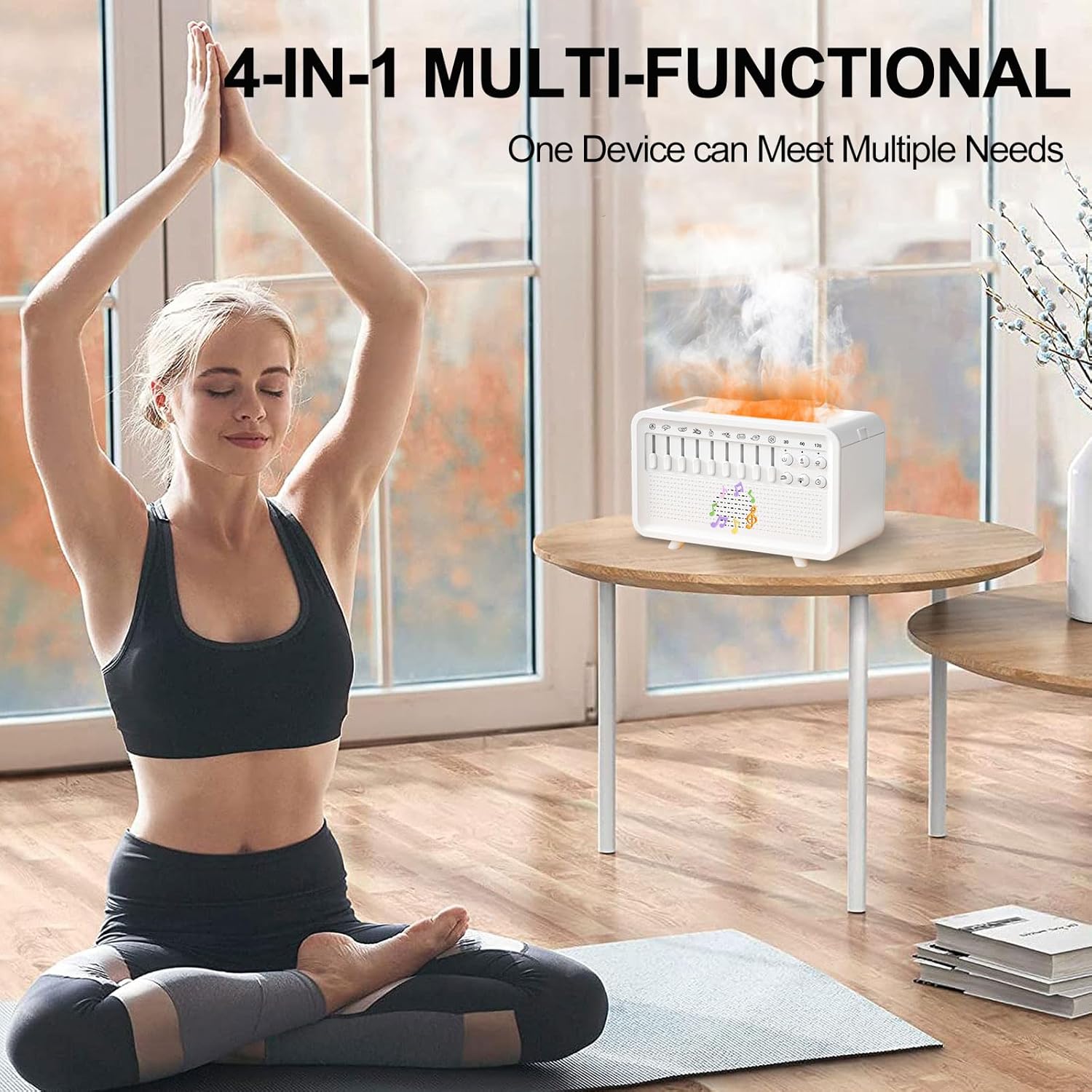 - Ambient Lighting Adjustment: White noise night light humidifier equipped with a soft nightlight with multiple adjustable brightness levels, it provides warm lighting while forming a simulated flame with the spray to create a personalised sleeping atmosphere.